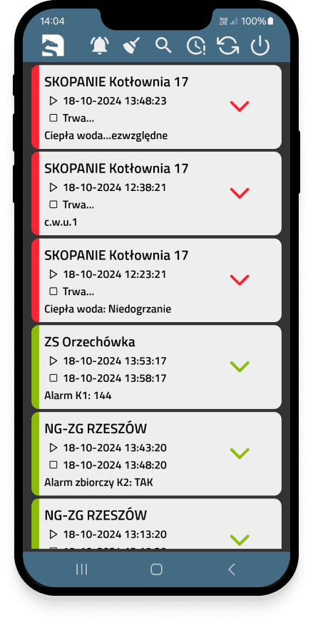 Otrzymuj powiadomienia alarmowe zwracane przez automatykę kotła oraz dodatkowe analizowane przez nasz system. Dostępne w aplikacji Scontrol Alarmy, jako SMS lub e-mail.